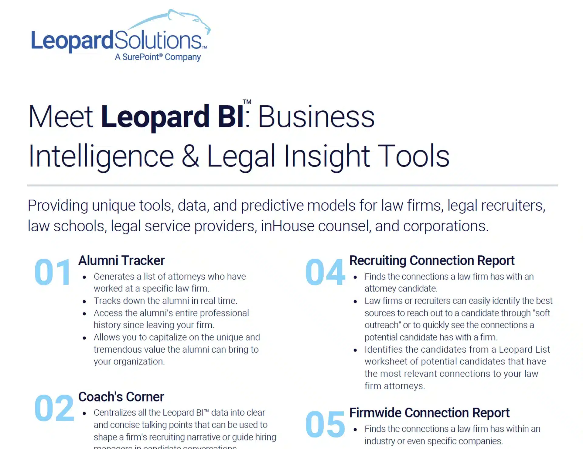 SurePoint Legal Insights (formerly Leopard Solutions) delivers continuously updated attorney intelligence—powered by AI and validated by human review—so legal search consultants can source talent with precision, engage earlier, and make stronger placements.